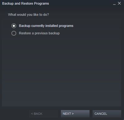 Sometimes, you can restore a game save using the Steam launcher for a variety of games. To see if a backup is available, head back to Steam on the top left of your screen and select Backup and Restore Games. Here, choose to Backup currently installed programs or to Restore a previous backup. Click on Next to see if a backup is available for the title you wish to restore.