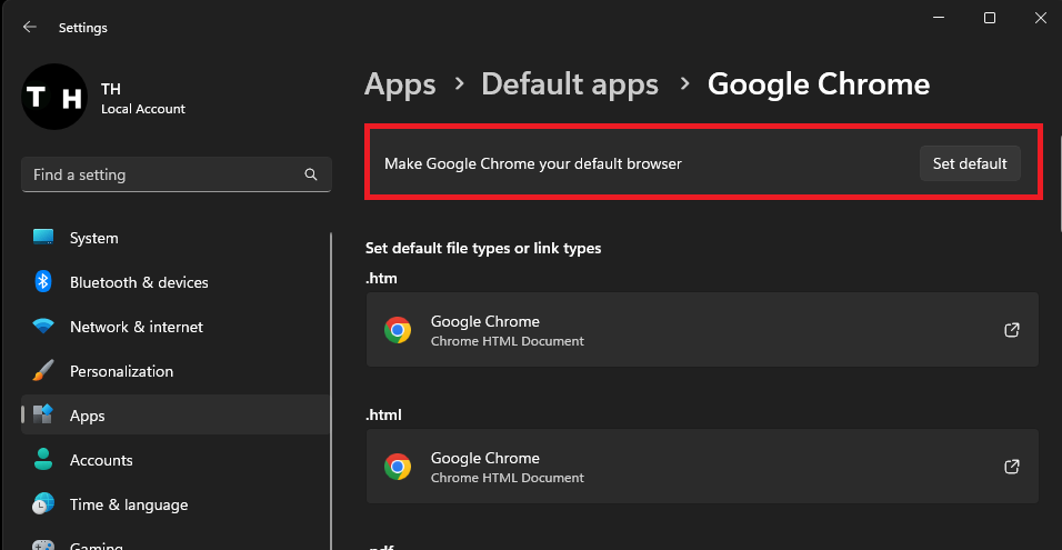 Scroll through the list until you locate Google Chrome (or your browser of choice). Click on it, and then select "Set default".