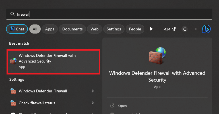 Search for 'Windows Defender Firewall' in your start menu to access the Firewall settings.