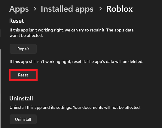 Windows Settings > Apps > Installed Apps > Roblox > Advanced Options
