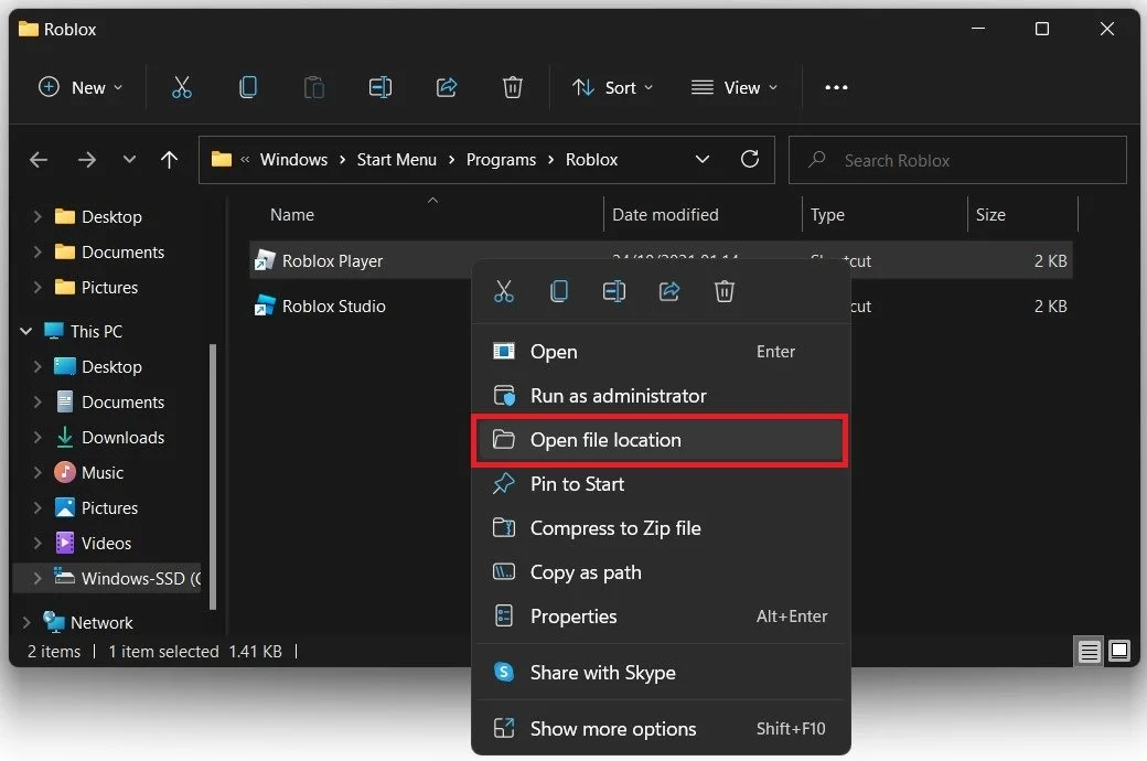 After correctly naming all of your five cursors, search for Roblox in your taskbar or start menu search. Right-click the Roblox player and select Open File Location. A new folder will open up, where you will have to right-click the Roblox player app again and select Open File Location.