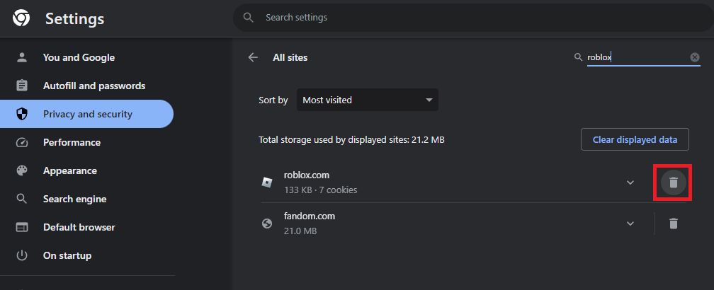 Delete Roblox Data: Type “roblox” in the search bar and proceed to delete your Roblox.com site data and cookies.