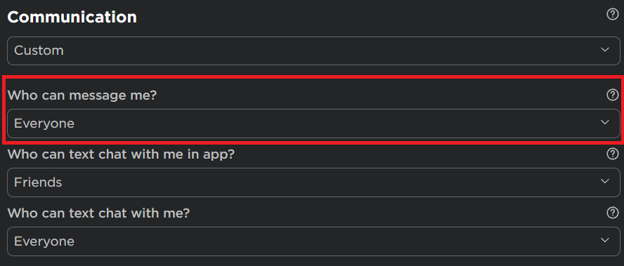 Roblox Privacy Settings > Communication > Who can meesage me? (Everyone)