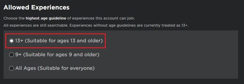 Lastly, in the Parental Controls section, setting the Allowed Experiences option to 13+ will ensure you can access all types of experiences within Roblox. Some users will have to enter the Parent pin to change these settings.