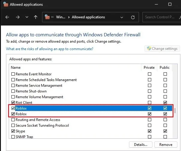 Here, select Allow an app through the firewall. On this window, click on Change settings, look up Roblox and make sure that both of these checkboxes are checked before closing this window.