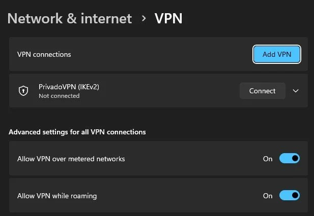 Next, open up your Windows settings. Under Network & internet, click on VPN and ensure your VPN connection is disabled. A VPN can be very useful, but it can also cause network errors with Roblox. If you are looking for a reliable VPN connection, we recommend PrivadoVPN.