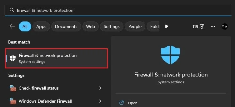 First, ensure that the Roblox app is not running on your PC and search for Firewall to open up your Firewall & Network Protection system settings window.