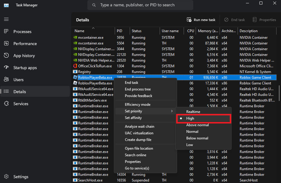 Once you've configured your settings, keep the game active and launch the Task Manager. Within the Processes section, right-click the Roblox Game Client process and select Details. In the Details tab, RobloxPlayerBeta.exe should be highlighted. Right-click this process and set its priority to High.