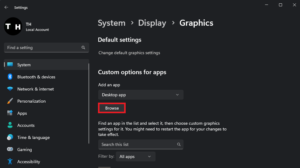 Under Related Settings, click on Graphics. You can assign a graphics preference for applications and games when they are running on your PC. To add Roblox, click Browse to open up your file explorer.