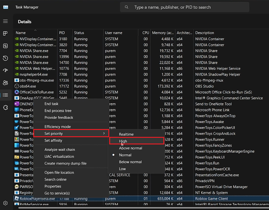 Right-click 'RobloxPlayerBeta' and select 'Set Priority' to 'High'.