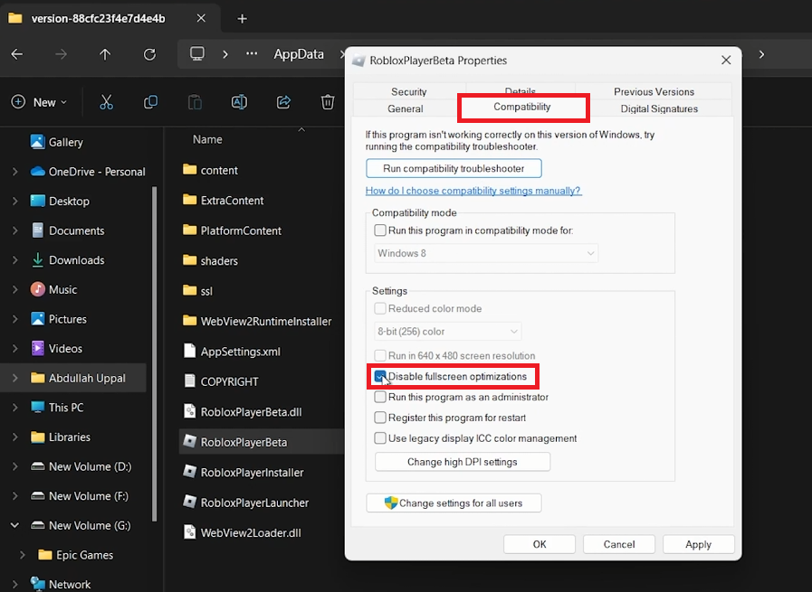 Disable Fullscreen Optimizations: In the 'Compatibility' tab, check 'Disable fullscreen optimizations'.