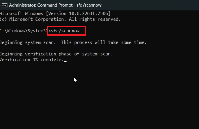 sfc /scannowand press Enter.This command initiates a system scan, which can take a few minutes.