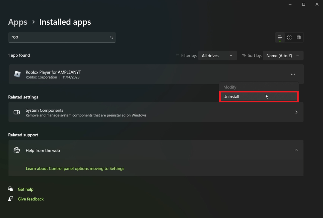 Click on the three dots next to Roblox and select 'Uninstall'.