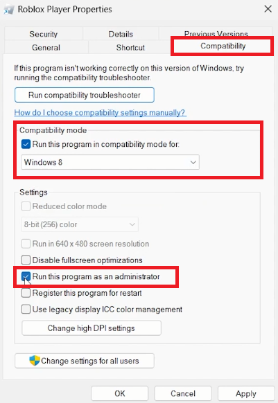 Navigate to the Roblox launcher properties, switch to the “Compatibility” tab, check "run this program in compatibility mode," select Windows 8, and also check "run this program as an administrator.”