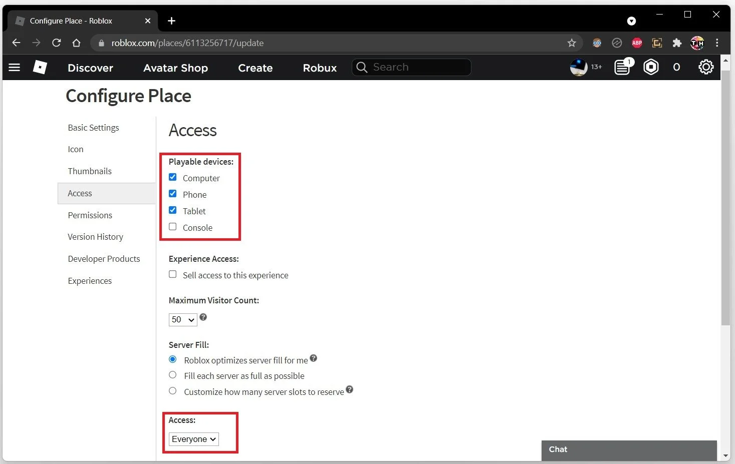 Navigate to the Access tab. There, you will need to give access to the playable devices from which you wish your friend could access the game. Below, set the Access option to Everyone or Friends. When choosing only friends to access the experience, add the player to your friends list. After saving your changes, it’s recommended to add the user to your friends list, even when you set the access to this experience to Everyone, as you can invite the user to the private server.