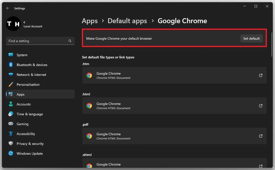 Search for the browser you are using for Roblox, in my case that would be Google Chrome, and select it. You can then click on Set default to make Google Chrome your default browser or any other browser you wish to use.