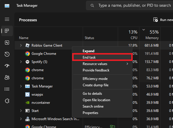 Look for any active processes related to Roblox. This could include the game client or processes like shaders or mods.