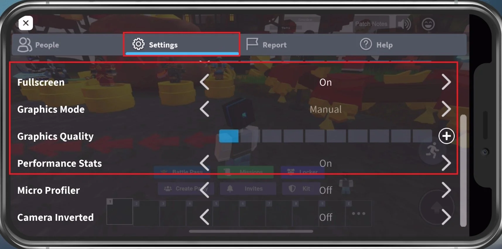 Roblox Settings > Fullscreen, Graphics Mode, Graphics Quality, Performance Stats