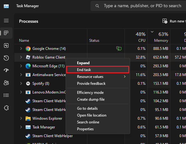 Under 'Processes', end all running Roblox tasks, including related processes like shaders or mods that may modify game files.