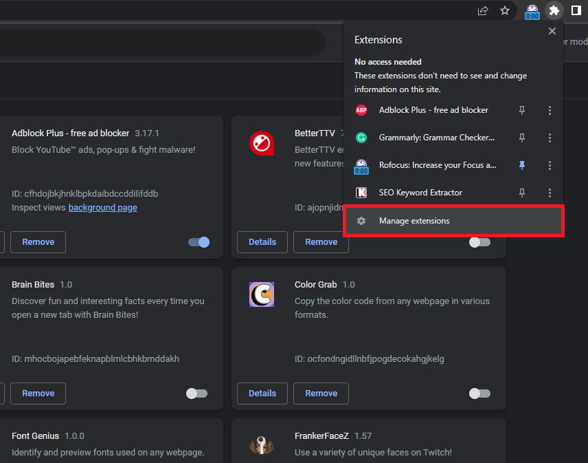 Browser extensions can sometimes interfere with the smooth running of online games like Roblox. In Chrome, click on the jigsaw puzzle icon (Extensions) on the toolbar and select “Manage Extensions”. Here, disable all extensions temporarily to test if they're causing the problem. This principle applies to all browsers, even though the steps might differ slightly.