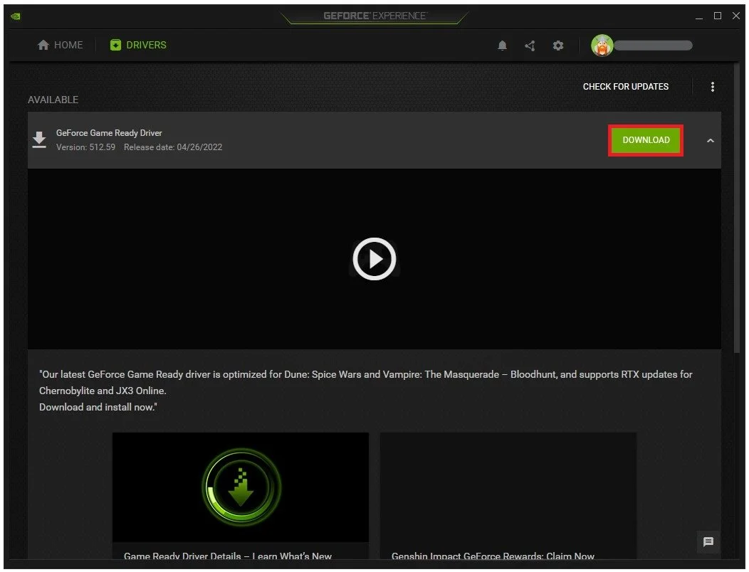 You should ensure that your graphics driver is up to date. I suggest using the GeForce Experience application if you’re using an NVIDIA GPU, but you can also use the AMD Radeon Software. In the Drivers tab, click on download, which will automatically download and install the latest driver, which can in a lot of cases fix startup issues for Roblox on your PC.