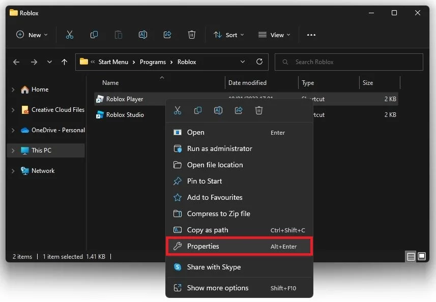 In your file explorer, right-click the Roblox Player application and select Properties.