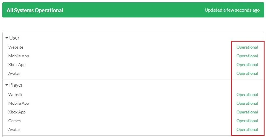 First, ensure that the Roblox servers are operational, as this problem is usually caused by a network or server issue. Navigate to status.roblox.com. Here, expand User and Player and ensure the servers are operational. If this is not the case, you will have to wait until the server maintenance is done.