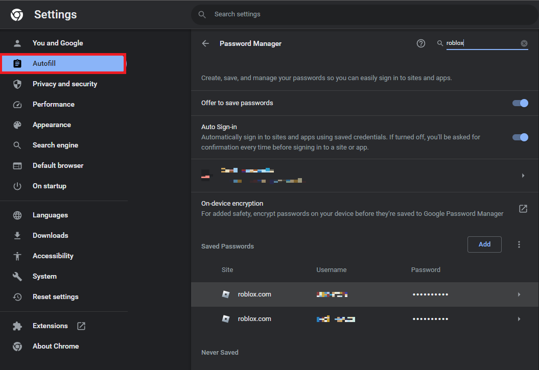 In the “Autofill” section, select “Password Manager”. Search for Roblox, and then you should be able to find your login information if you ever saved it on your browser. The same applies to other password-managers, such as the one on your mobile device.