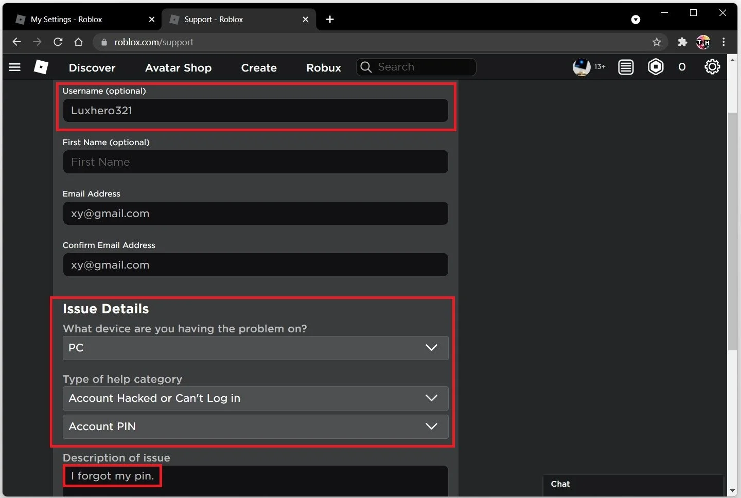 In case you don’t remember your pin or feel like someone hacked into your account and changed it, there is a common way to contact support and ask them to completely remove the pin without knowing it. To do so, navigate to roblox.com/support. Your Roblox username should automatically be inserted. Below, add the email address associated with your Roblox account, and confirm it to ensure that Roblox support can contact you.