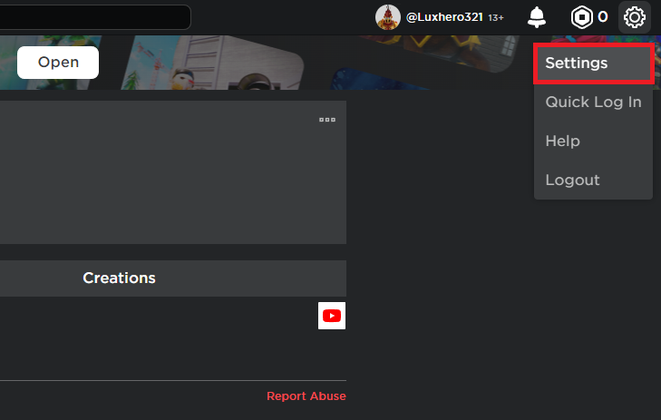 Make sure to close Roblox and open up your browser of choice. Navigate to Roblox.com and ensure you’re logged in with the correct account. Next, click on the gear icon on the top right of this window and select Settings.