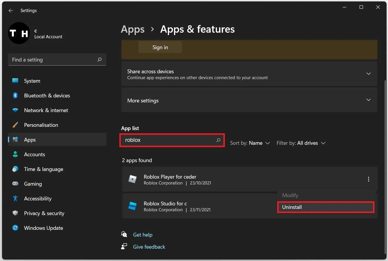 In your apps list, search for Roblox. Click on the burger menu for the Roblox Player and select Uninstall. This will take a few seconds to uninstall the Roblox application from your system.