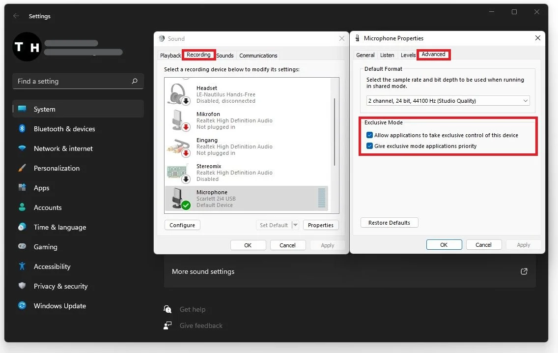 Back in your advanced sound settings, click on More sound settings. Your Sound Control Panel will open up. Ensure only your preferred input and output device is enabled. Double-click your Recording device, and in the Advanced tab, set the Default Format to 44’100 Hz, or 48’000 Hz, depending on your availability. Enable the two Exclusive Mode options, which will allow Roblox to change your input volume, for example.