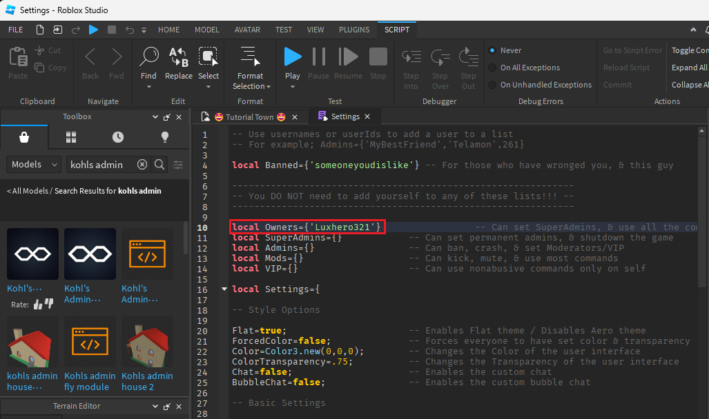 A new tab will open up. From here, you will have to add yourself as the owner to get admin permissions. Between these two brackets, insert your Roblox username between apostrophes. You can then close this window again. Any user who was added as the local owner will have admin privileges and commands at their disposal when playing the Roblox experience.