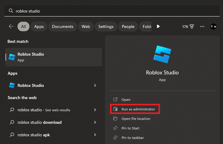 Lastly, search for Roblox Studio in your start menu search and select to run the application as an administrator. You’re required to have admin permissions to run Studio, which can fix a couple of potential startup issues for the application.