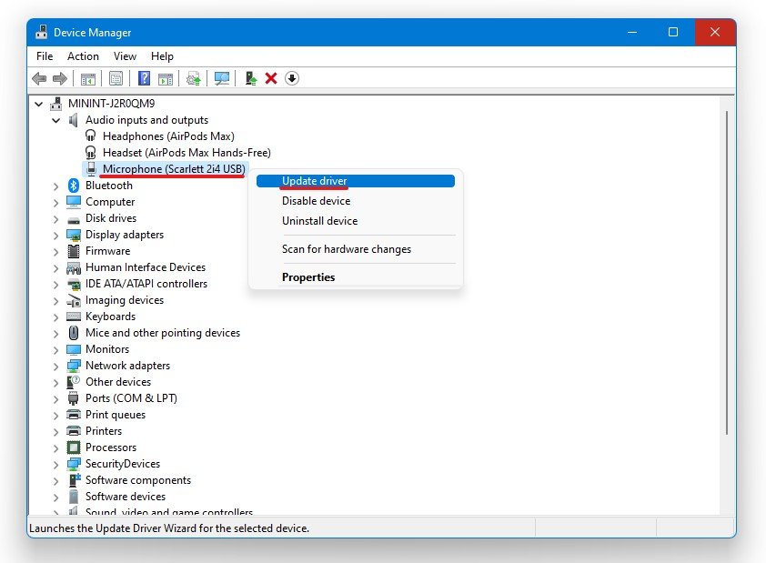 Device Manager > Audio Inputs and Outputs > Microphone > Update Driver