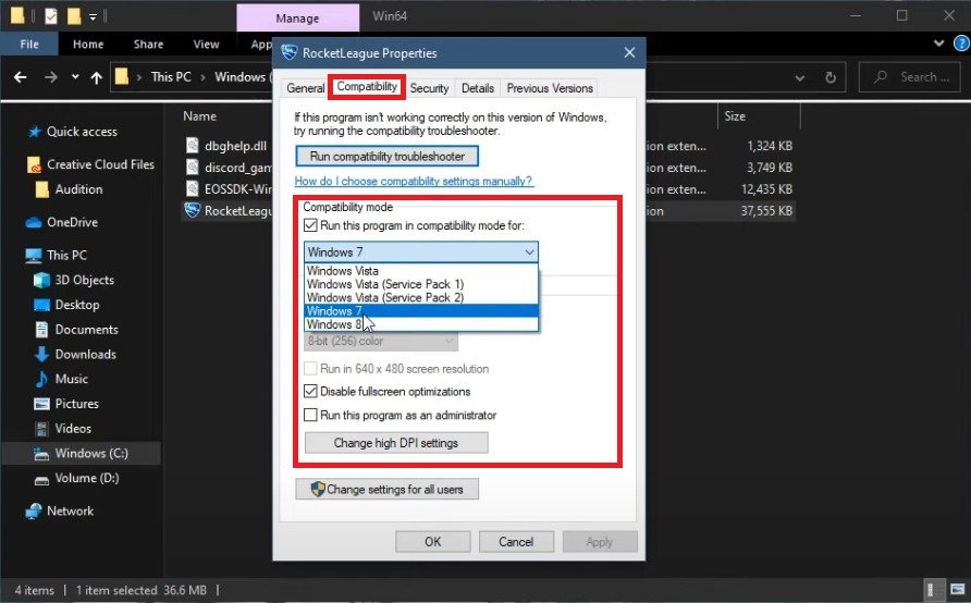 Open up your file explorer and navigate to the drive you saved Rocket League on. Go to: program files > Rocket League > binaries > Win64. Right-click RocketLeague to get to its Properties.