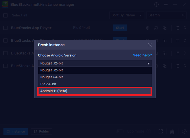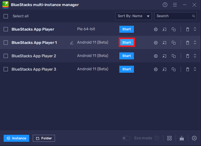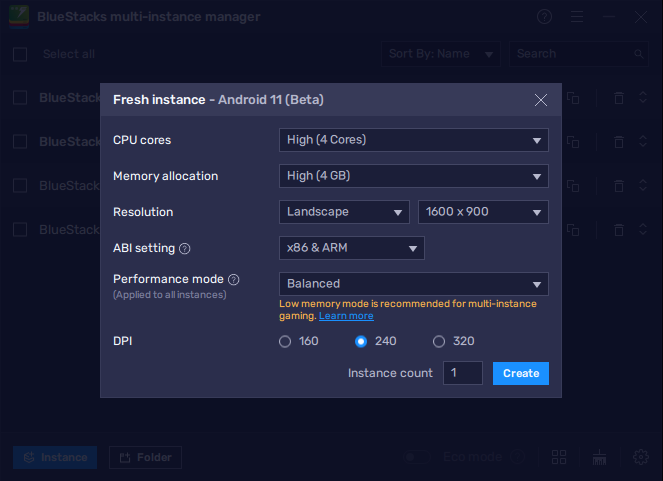 After clicking on Create, the emulator will download the required files to create the Android 11 instance, and you can then stop the previously opened BlueStacks App Player and start the Android 11 App Player. It will take a couple of seconds to start BlueStacks.