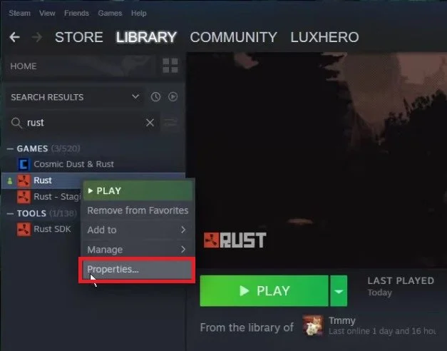 There are different ways of displaying your FPS (frames per second) and latency, and in this tutorial, we will use the built-in counters, as these should be the most reliable. Close Rust and open up your Steam library. Eight-click Rust and select Properties.