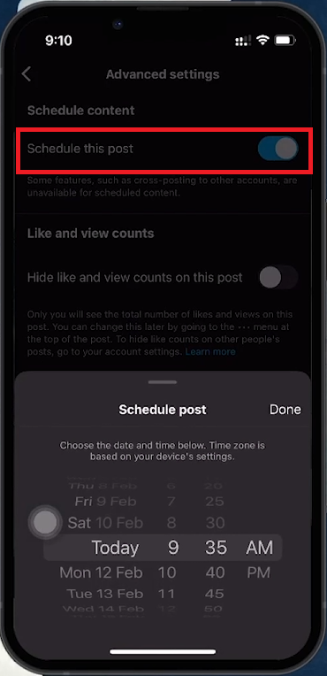 After creating your post, tap on 'Advanced Settings' before publishing, and activate the 'Schedule this post' toggle. Choose your desired date and time, and confirm with 'Set Time’.