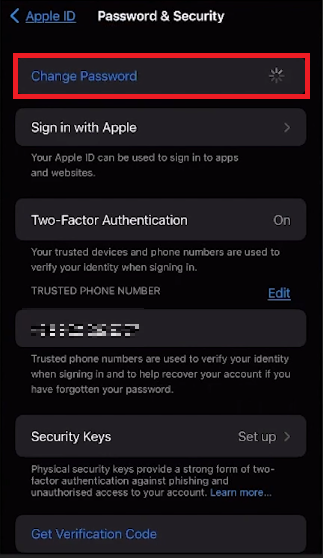 Change Password.Upon prompt, enter your device’s passcode to proceed to the password reset page.