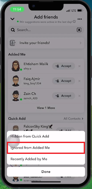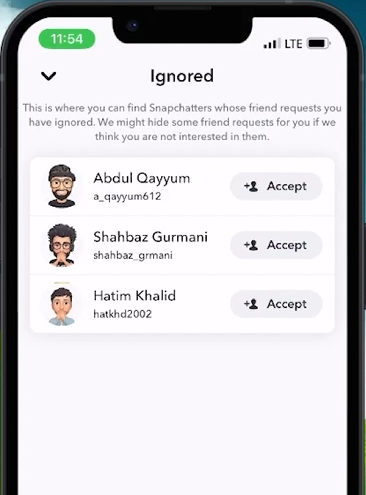 If the friend doesn't appear initially, restart the Snapchat app and recheck the “Ignore from Added Me” list.