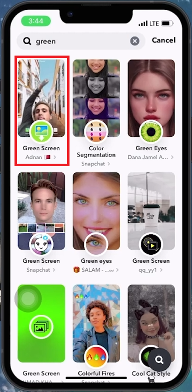 Select the Filter: From the search results, choose the Green Screen filter provided by Snapchat.