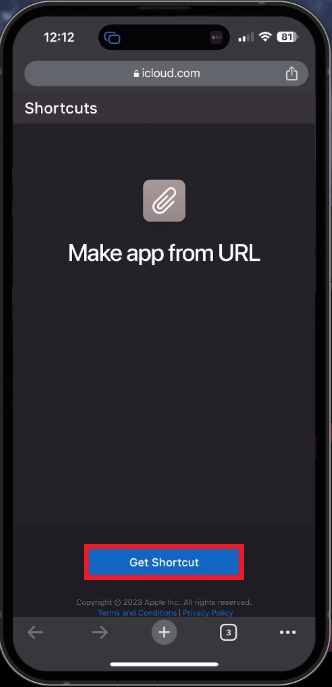 This action will bring you back to the Shortcuts app, where you'll create a new "Make app from URL" shortcut. Tap "Add Shortcut".