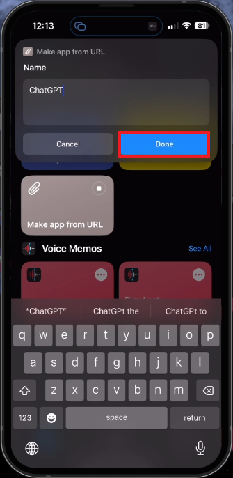 Return to the Shortcuts app and tap on the newly created shortcut. Assign it a name, such as ChatGPT, and then paste the ChatGPT URL before tapping "Done".
