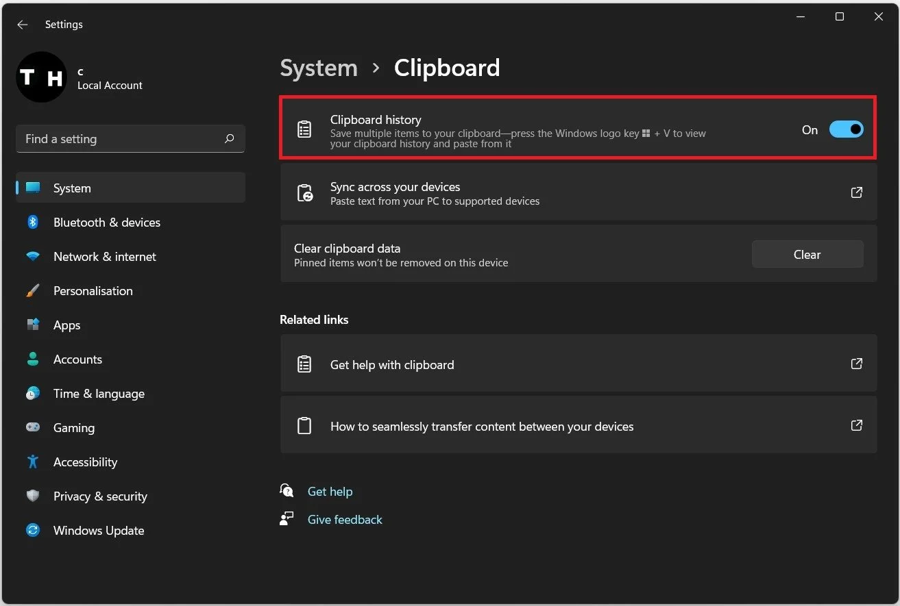 Turn on your clipboard and clipboard history in your system settings. Open up your settings window, and under System, scroll down and select Clipboard.