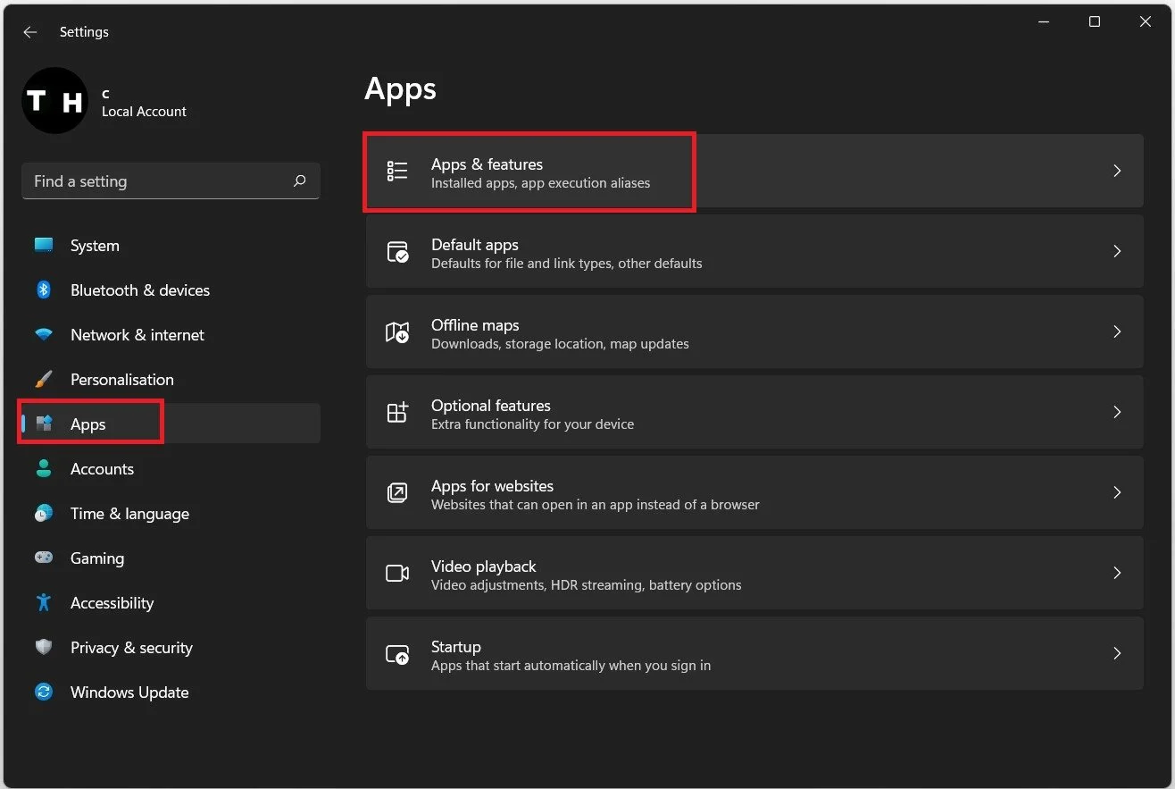 If the problem persists, navigate to the Apps tab in your settings window. Click on Apps & Features, and under Apps list, search for Snipping Tool.