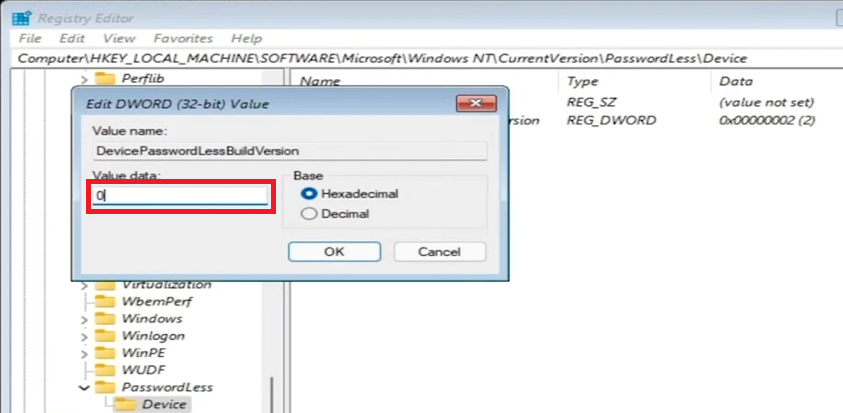 Locate the File: Find and double-click on DevicePasswordLessBuildVersion in the Registry Editor.