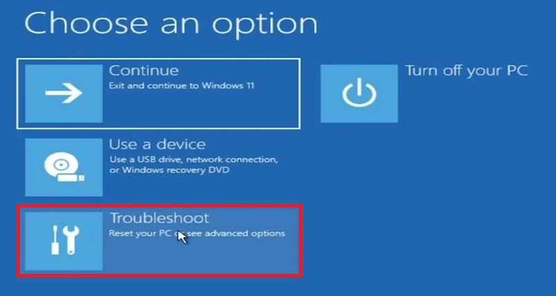 Enter Advanced Options: After the Shift restart, select 'Troubleshoot', then 'Advanced Options'.