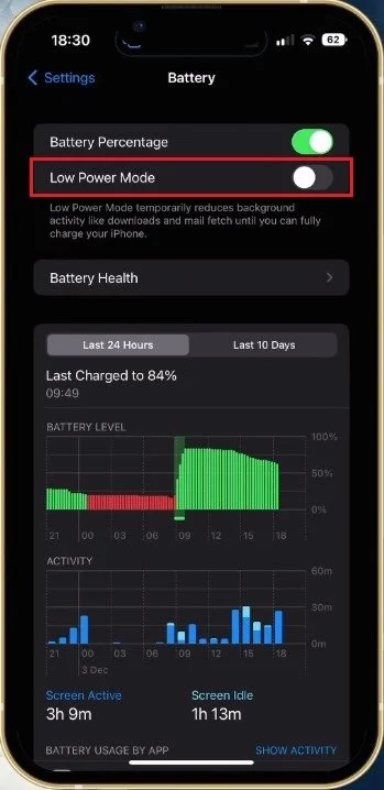 After taking a look at your iPhone storage, head back to your main settings and select Battery. Here, disable the Low Power Mode. This can slow down your iPhone when enabled, but your battery life will in turn also be reduced.