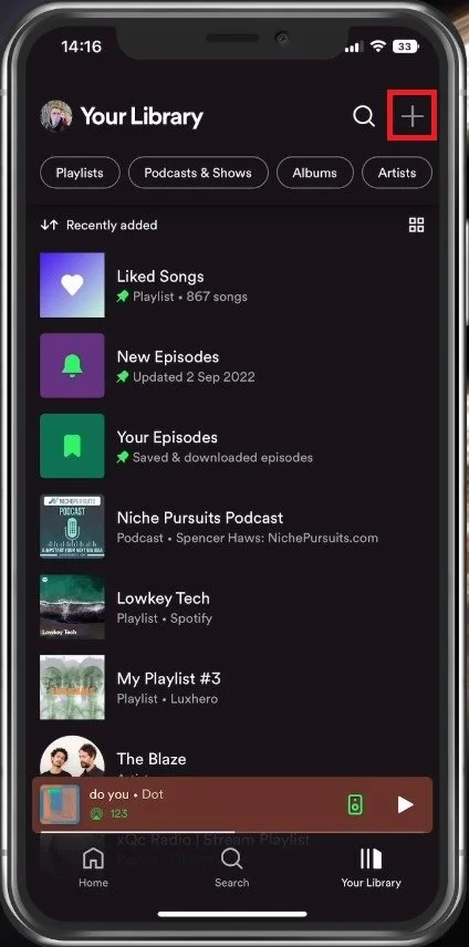 In your Spotify library, tap on the plus icon on the top of your screen to create a new playlist.